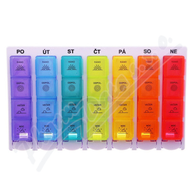 Týdenní dávkovač léků je rozdělen na 7 dní v týdnu pomocí zkratek názvů dnů v týdnu a každý den má 4...