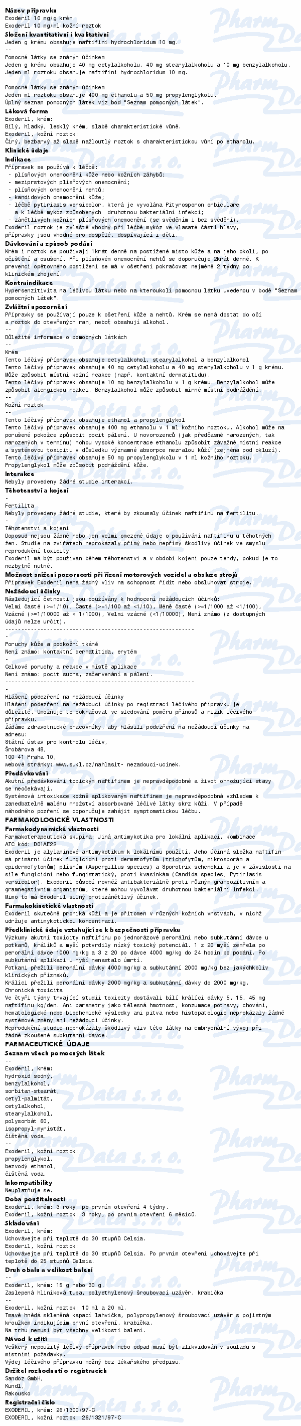 Přípravek Exoderil patří do skupiny léčiv zvaných dermatologika, antimykotika. Exoderil je antimykotický, protizánětlivý krém ke kožnímu podání. Jeho léčivou složkou je naftifin. Je účinný proti houbám, kvasinkám a plísním. Čtěte pozorně příbalový leták.