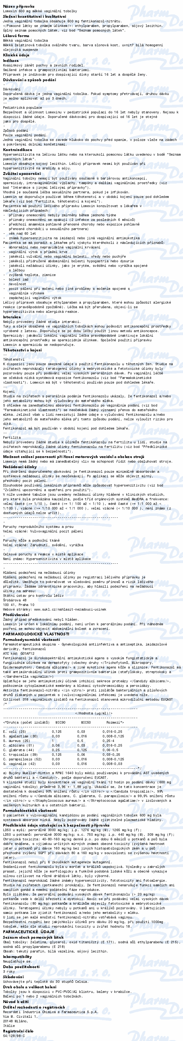 Přípravek Lomexin, s obsahem léčivé látky fentikonazol nitát, je antimykotikum účinné proti kvasinkovým mikroorganismům, zejména rodu Candida. Přípravek Lomexin se používá k léčbě kvasinkového zánětu pochvy a zevních rodidel. Čtěte pozorně příbalový leták.
