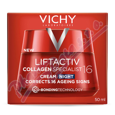 Vichy Liftactiv Collagen Specialist 16 noční krém. NOVINKA: Receptura s inovativní technologií Co-Bonding [Rhamnosa + Peptidy + Maitake] pomáhající posilovat pleť postiženou ztrátou kolagenu.