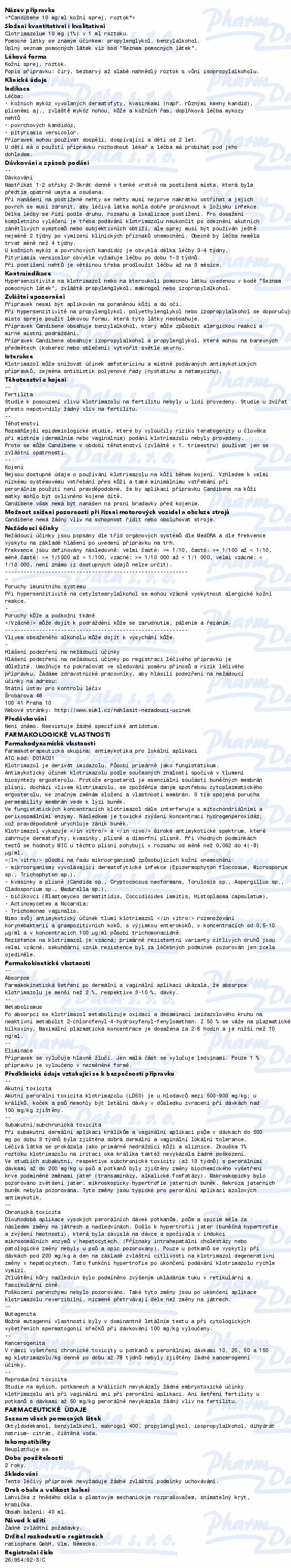 Léčivá látka přípravku, klotrimazol, je antimykotikum pro kožní podání. Tlumí růst řady choroboplodných hub, včetně dermatofytů, kvasinek a plísní. Působí i na některé druhy bakterií. Používá se k léčbě infekcí kůže a nehtů dospělých a dětí od 2 let. Čtěte pozorně příbalový leták.