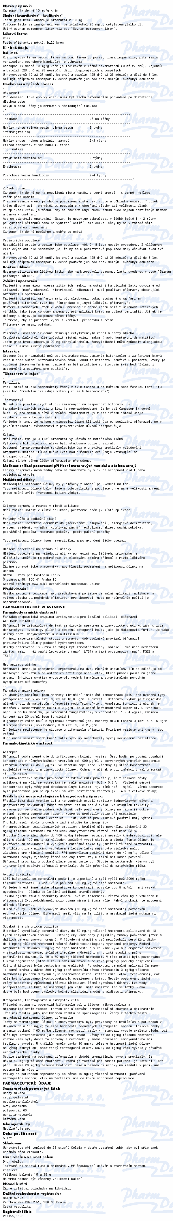 Léčivá látka přípravku Canespor 1x denně krém je lokální antimykotikum se širokým spektrem účinku k místní léčbě kožních infekcí vyvolaných kvasinkami, plísněmi a jinými houbami. Čtěte pozorně příbalový leták.
