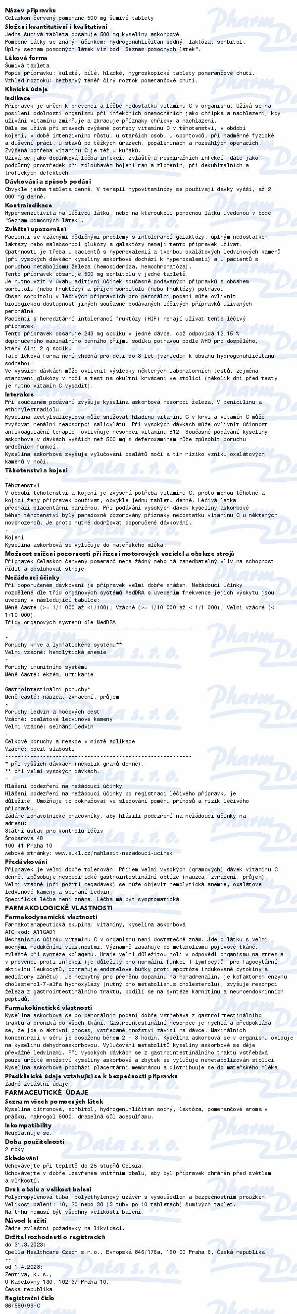 Rozpustná forma Celaskonu s chutí červeného pomeranče je vzhledem k rychlejšímu nástupu účinku vhodná při akutním nedostatku zmíněného vitaminu. Vitamin C se užívá při předcházení a léčbě nedostatku vitaminu C. Čtěte pozorně příbalový leták.