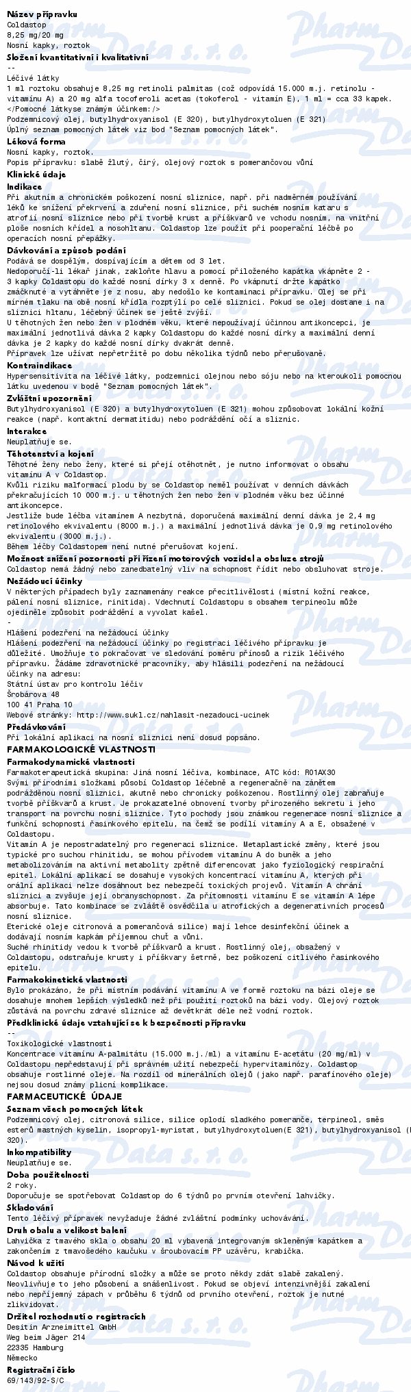 Coldastop se používá při akutním a chronickém poškození nosní sliznice a lze použít při pooperační léčbě po operacích nosní přepážky. Čtěte pozorně příbalový leták.