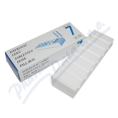 Plastový dávkovač léků s odklopným víčkem. Má 3 přihrádky na každý den. Umožňuje precizní rozvržení léků.