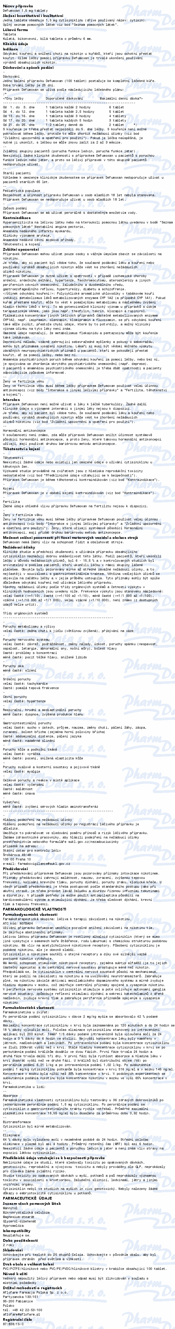 Defumoxan je určen k odvykání kouření a snížení chuti na nikotin u kuřáků, kteří jsou ochotni přestat kouřit. Cílem léčby pomocí přípravku Defumoxan je trvalé ukončení používání výrobků obsahujících nikotin. Defumoxan je určen pro dospělé. Čtěte pozorně příbalový leták.