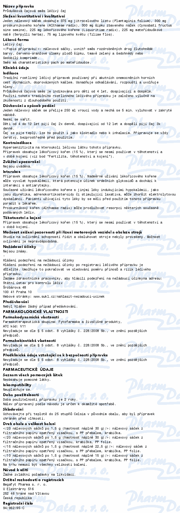 Přípravek se užívá při akutních a chronických onemocněních horních cest dýchacích, doprovázených kašlem. Čtěte pozorně příbalový leták.