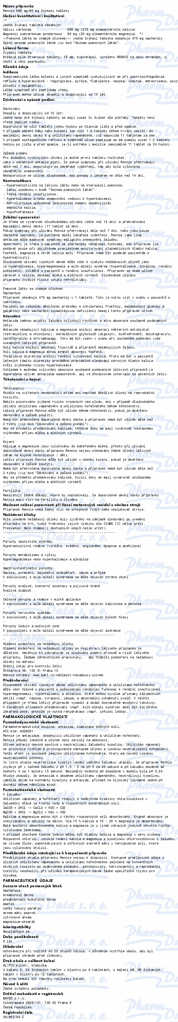 Rennie žvýkací tablety jsou léčivým přípravkem, který chrání sliznici žaludku a tenkého střeva tím, že působí proti překyselení žaludeční šťávy. Čtěte pozorně příbalový leták.