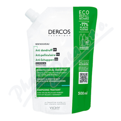 VICHY DERCOS šampón proti lupům s vylepšeným působením se SELENIEM DS. Obsahuje sulfid seleničitý. Zabraňte kontaktu s očima a poškozenou kůží. V případě vniknutí do očí ihned důkladně vypláchněte. Náhradní EKO náplň.